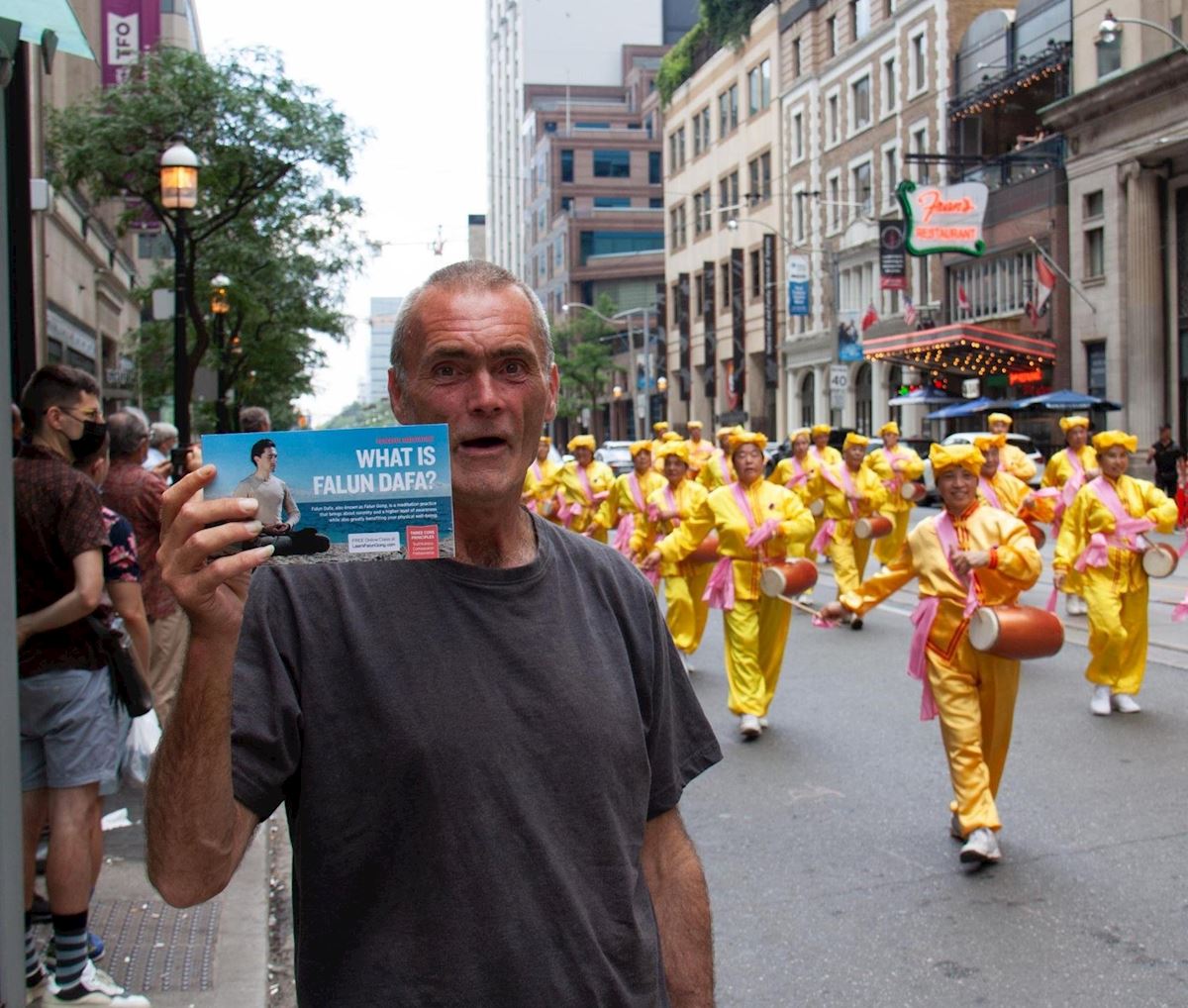 多伦多居民格兰(Glenn)一直在寻找如何让心灵更安宁的方法。他说:“我每天经常祷告,但心中总感不到平静,我看到你给我的传单上的这位正在打坐的男士,他特别的祥和,令我好奇法轮大法到底是什么。”格兰先生问了很多问题,学员一一解答。当学员提到法轮功学员在中国仍遭受迫害时,他说:“我没去过中国,没想到这样的事情仍在发生,你们在海外自由了,愿神保佑你们!”