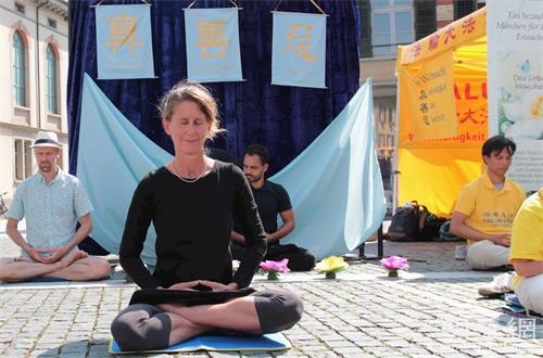 一位路过的摊主看着学员们静静打坐的场景,尤为赞叹和佩服。她说:“这份心中的宁静是世界上最美好。应让学校里的学生们修炼法轮功,这会对他们的身心有很大的帮助。”