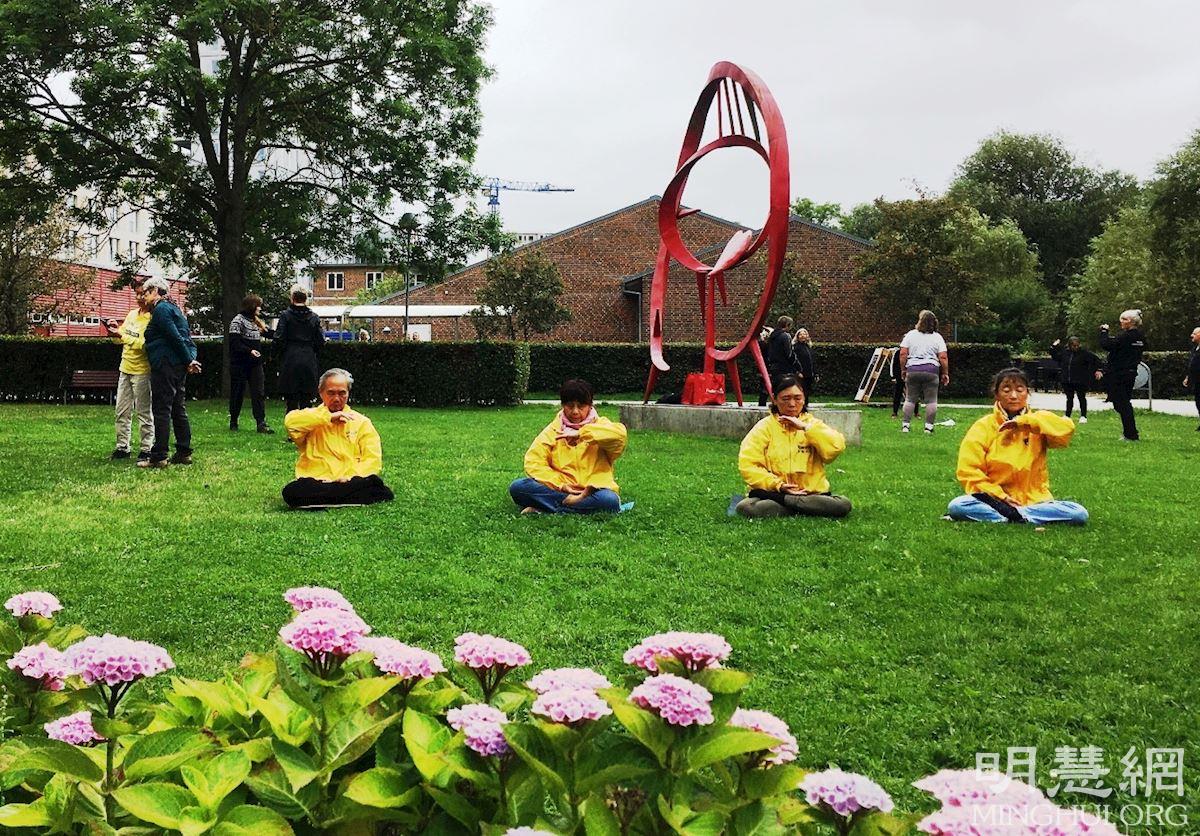 '图1~2:二零二一年八月二十八日,丹麦奥胡斯市(Aarhus)举办文化周活动,图为法轮功学员在展示五套功法。'