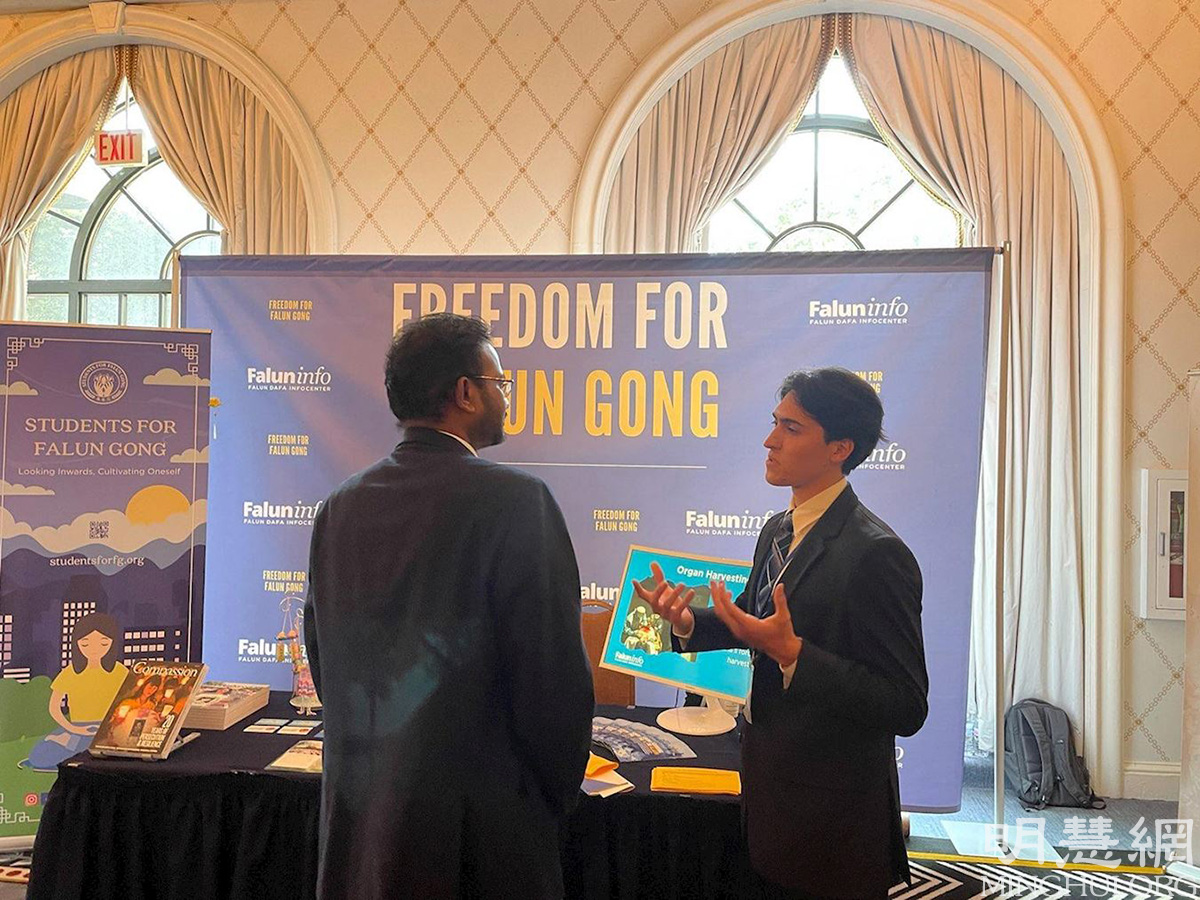 来自德克萨斯州的17岁少年艾萨克和他的父亲一起参加了本次峰会。在峰会开幕酒会上,艾萨克遇到了一位年轻的法轮功学员者,了解了法轮功及其在中国受到的迫害。接下来的三天里,艾萨克每天都去法轮功的展位,与那里的青年学员交谈。