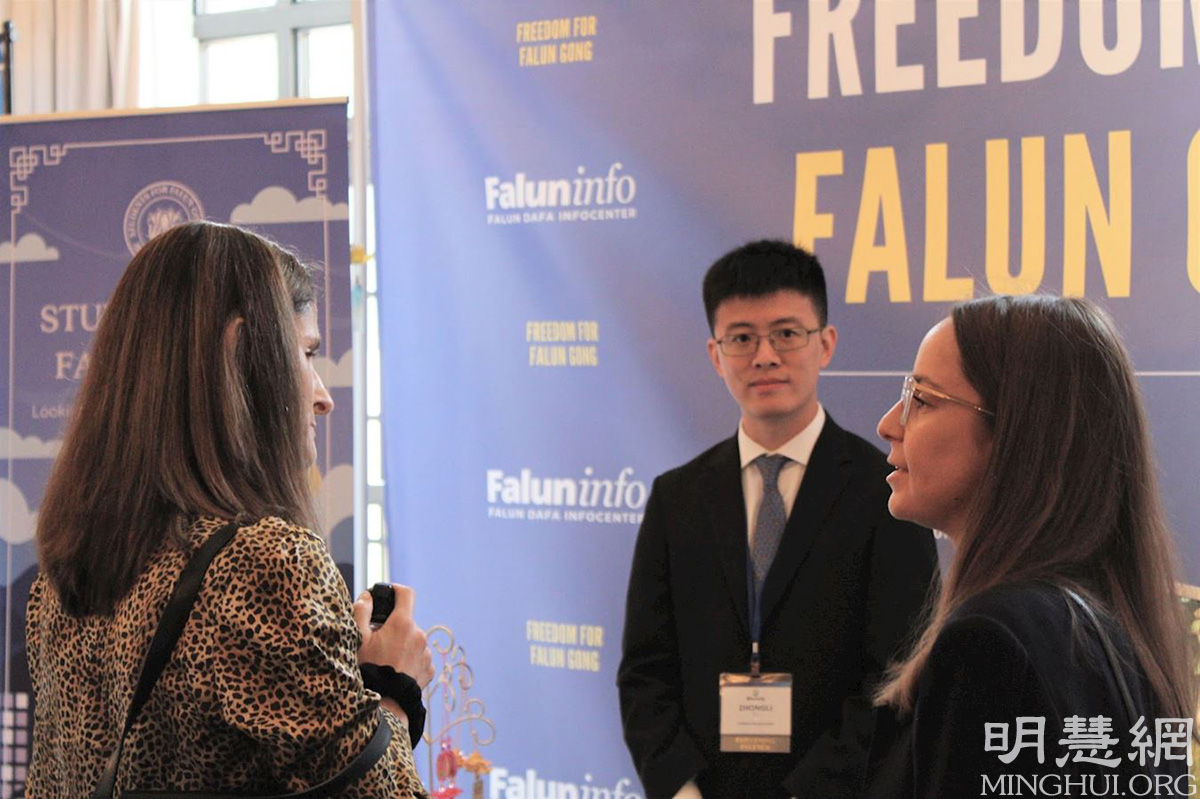 法轮功学生会是展厅中46个展位之一。来自社会各界不同年龄的人来参观了这个展位。法轮功学员们向宗教领袖、大使馆成员、议员、企业家、媒体发言人和记者、国际研究的年轻实习生等讲述了法轮功被迫害的真相。