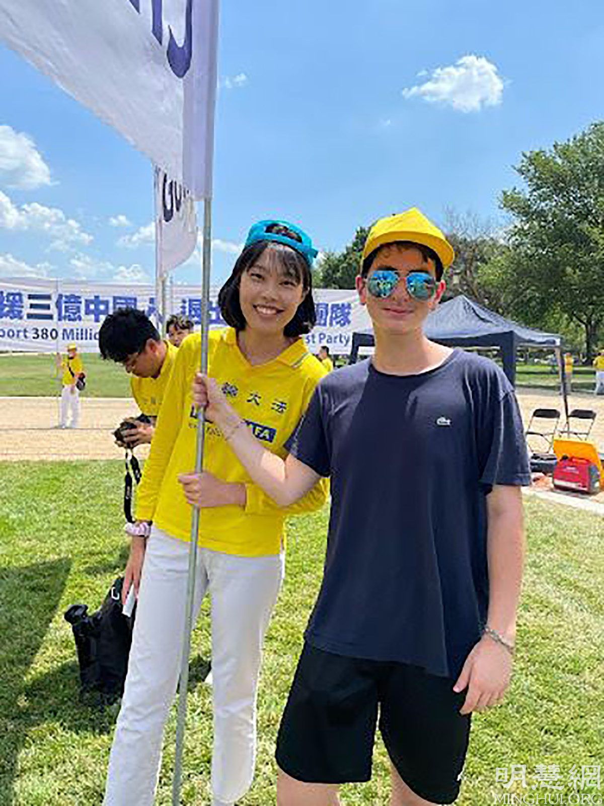 '图5:2021年7月16日,艾萨克(右)与一名来自法轮功学生会的学员在法轮功反迫害集会上举着横幅。'