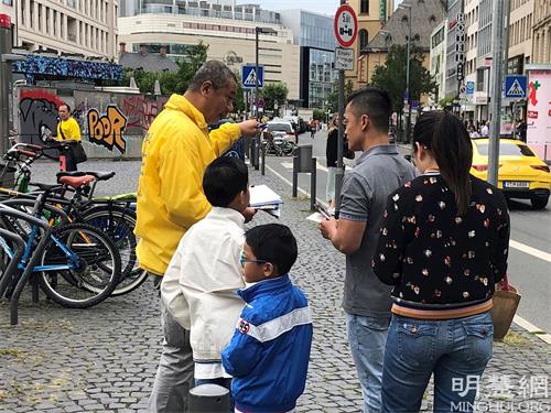 来自中国大陆的女孩小黄(化名)还不到二十岁,一下子就被活动吸引住了,在现场待了近两个小时。七、八年前她离开中国时,年纪还很小,没听说过法轮功。当天她和一位朋友正好来法兰克福玩。她说:“我的朋友看到法轮功的横幅,对我说‘你看,是你们国家的文字’,于是她就把我拉过来了。”