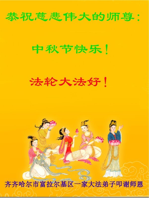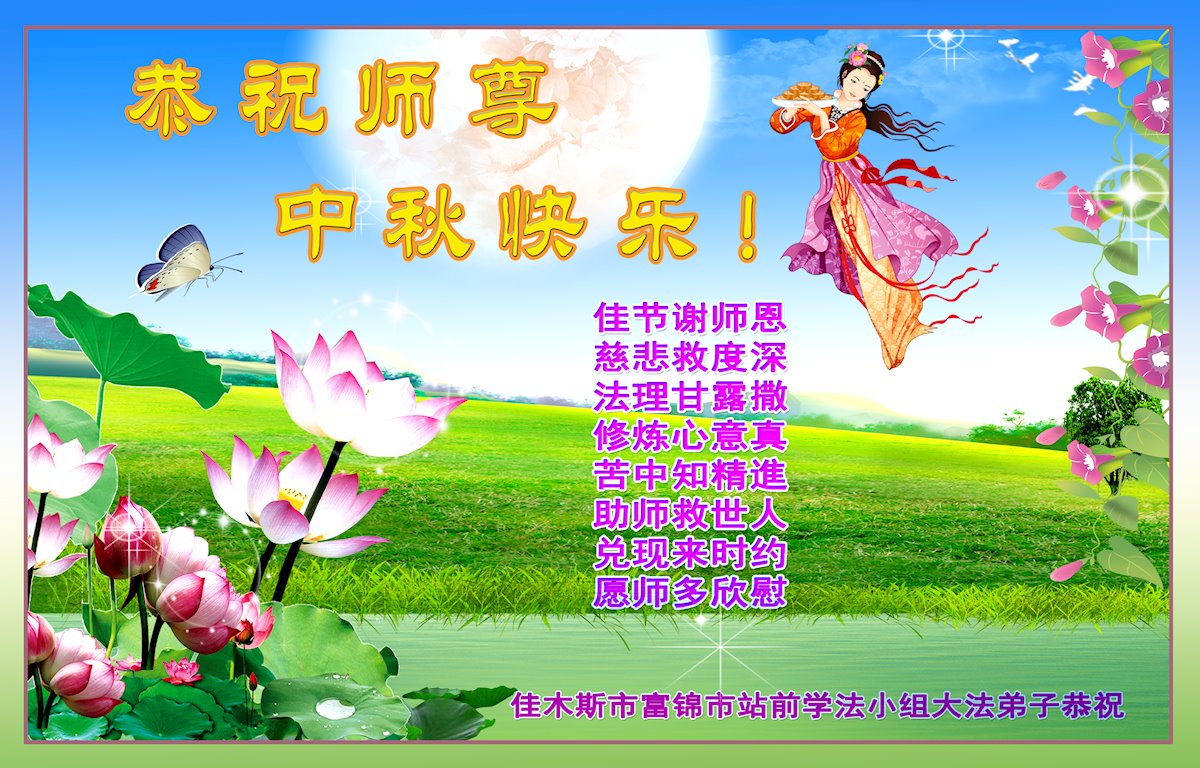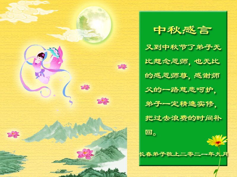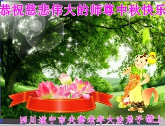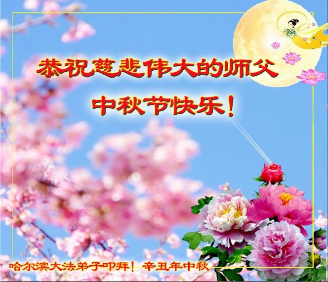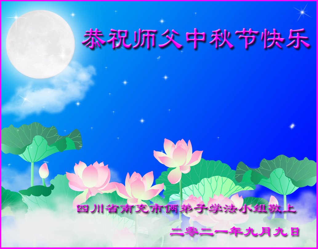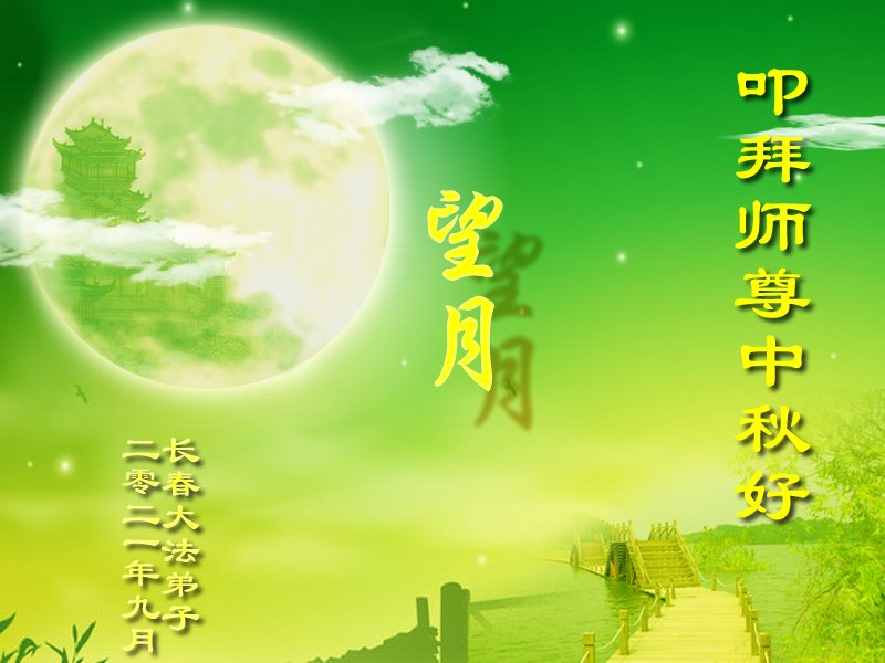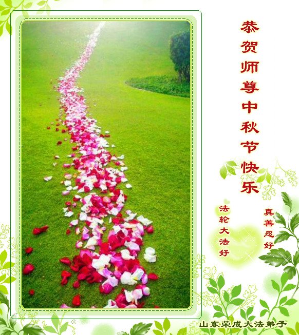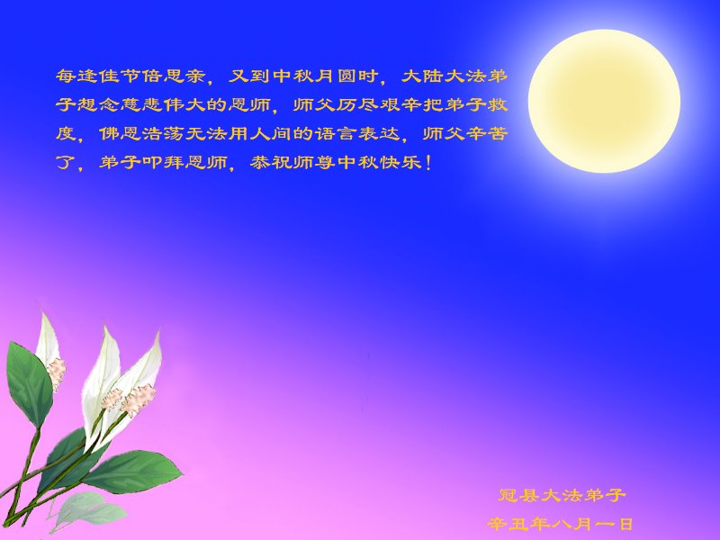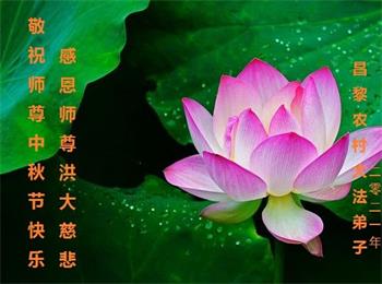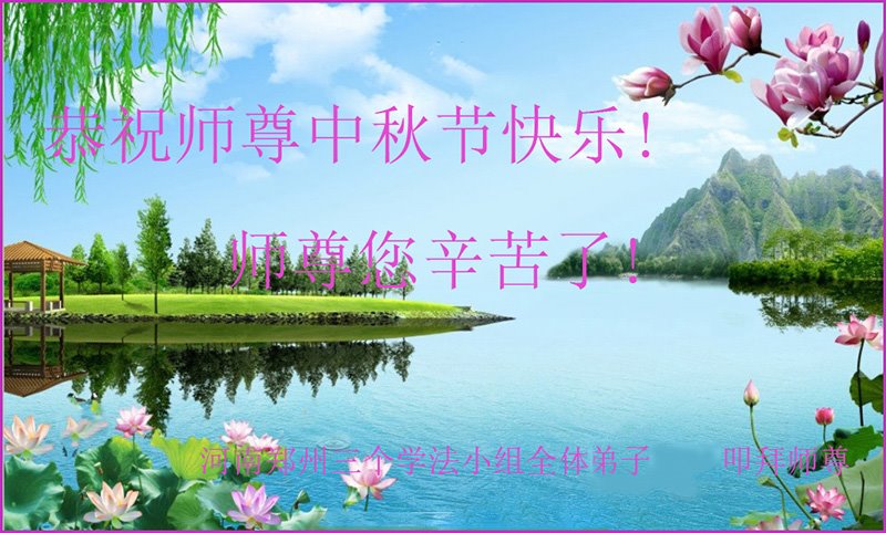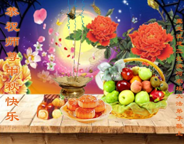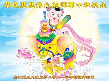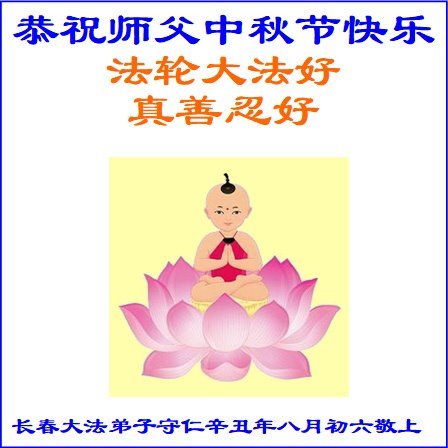 脑中装着大法,生命就有了希望,心中装着众生,再苦也不觉的辛劳,感恩师尊将法轮大法的法理捧到了我们的面前,赋予我们大法弟子的神圣荣光。每逢佳节倍思亲,值此中秋佳节即将来临之际,衷心遥祝师尊中秋节快乐!愿法轮大法好的佛光普照人间!