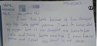我,卡图巴,受到我哥哥的启发来读这本书,因为他想让我提升自己的生活方式。我曾经在家庭和社区中恶名昭彰,是个和耻辱相连的人。可是现在如果有人愿意赞助,我甚至想要重返学校去读书。这本书真的让我改变了。