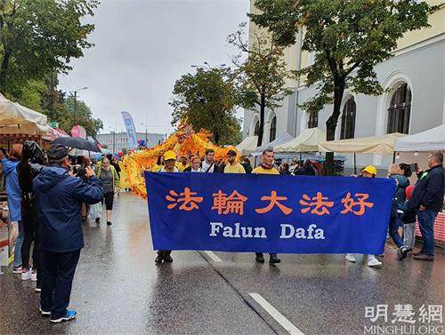 当天虽然天气阴雨绵绵,市民依然是倾城而出,街道两旁站满了观众。法轮功学员在游行队伍中,打着“法轮大法好”、“法轮大法在波兰”、“法轮大法真善忍”的条幅,由法轮功学员组成的舞龙队员们身着黄色T恤,手舞金龙,这条金龙上下翻飞、喜庆洋洋,两旁观众不断掌声、笑声与赞叹声。