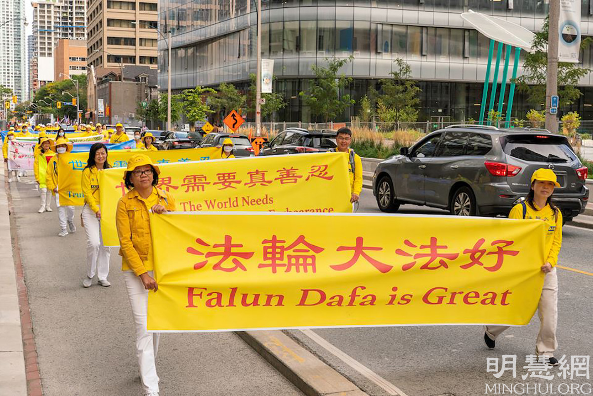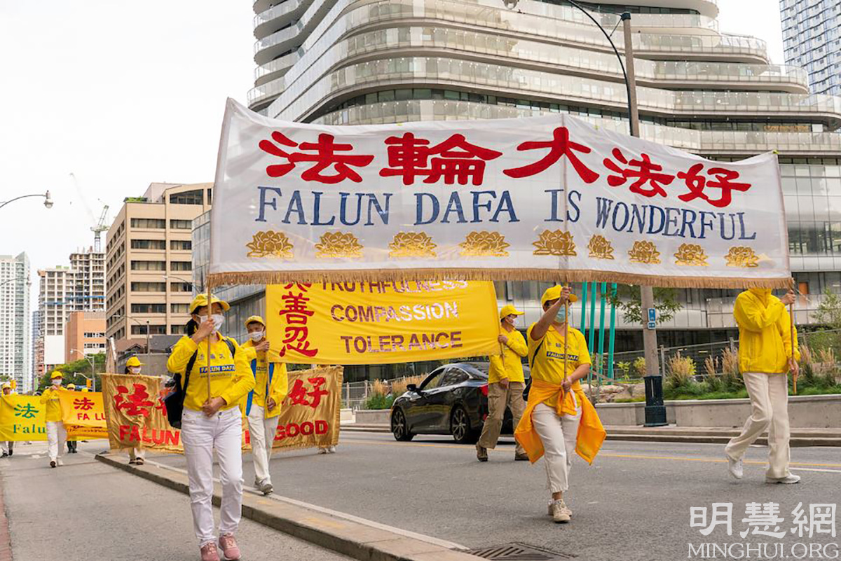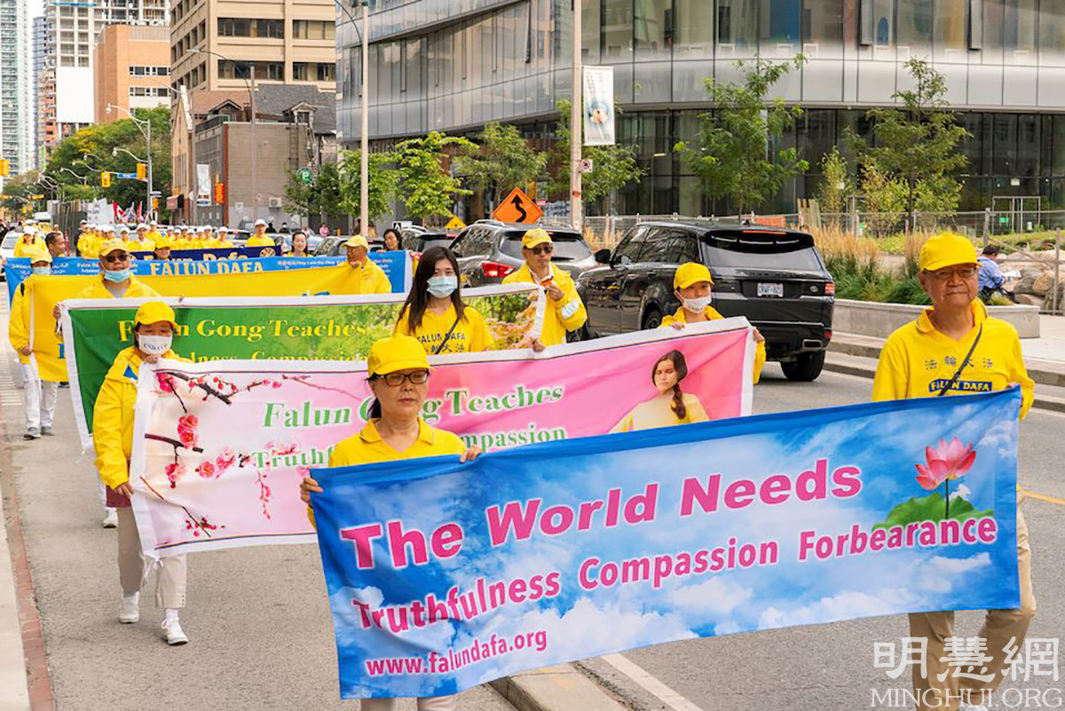 多伦多居民约翰(John)先生从中途跟着游行队伍一直走了終点,一路在和法轮功学员攀谈,约翰先生表示自己十几年前就知道法轮功,在不同的地方看到过法轮功学员举行的活动,并十分认同法轮功学员所提倡的真、善、忍价值观。