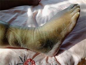 图2~3:出狱时下肢皮肤都是坏死的,呈黑色的
