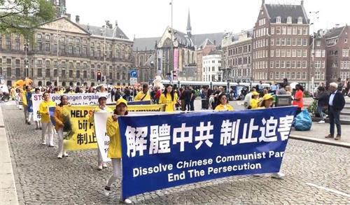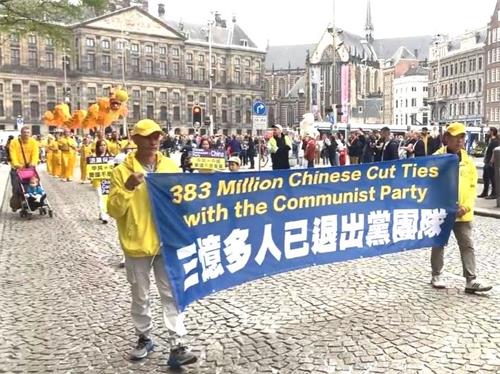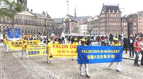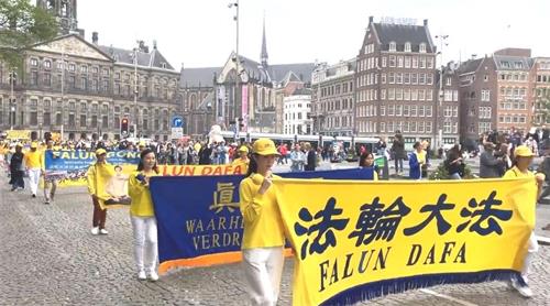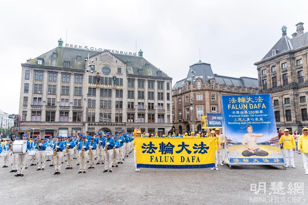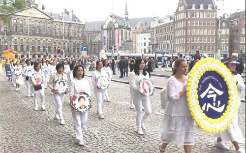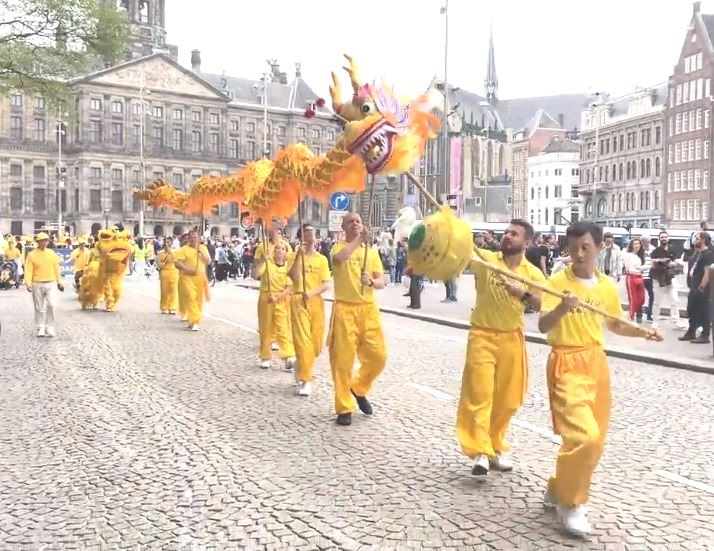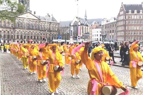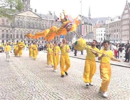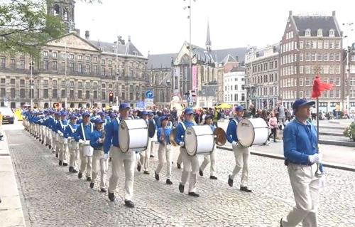 水坝广场的集会结束后,开始了盛大的游行。游行队伍从达姆广场穿过附近商业区及唐人街。欧洲天国乐团走在最前列,其成员来自欧洲不同国家,十多年来,他们的足迹遍及欧洲十几个国家。当天,他们演奏了“法轮大法好”、“法鼓法号震十方”、“欢乐颂”、“神圣的歌”等乐曲,嘹亮的音乐,震撼心灵,腰鼓队队员们表演了“法轮大法好”、“三退保平安”、等曲目,带给疫情中的人们希望和生机。
