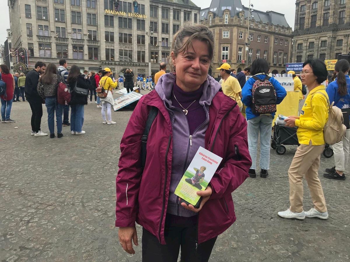 荷兰农业编辑安妮莉丝·巴克(Annelies Bakker)女士在国家博物馆广场看到法轮功的集会觉得很好奇,就走过来拍摄了很多照片,还收到了一张法轮功真相传单。当她了解了在中国发生的活摘器官真相后,十分震惊,她说:“活摘器官?我们在自由的荷兰不能想象!这样的事情如果发生在荷兰,我们会直接进入反抗。可是如果你们在中国反抗的话,可能会有被抓捕的危险,生活在荷兰,我们是幸运的。”