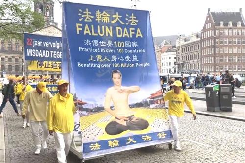 阿姆斯特丹水坝广场(Dam)是市中心最繁华的地方,也是荷兰最著名的旅游景点。尤其是周末,人来人往,游人如织。当天法轮功学员的反迫害集会在广场中心举行。现场布置着展台和真相展板,金色的展棚上挂满了真相横幅。学员们手中展示的横幅上写着“法轮大法好”、“法轮大法,洪传世界100国家,上亿人受益”、“世界需要真、善、忍”、“停止迫害法轮功”、“解体中共停止迫害”等,吸引了许多游人驻足观看。