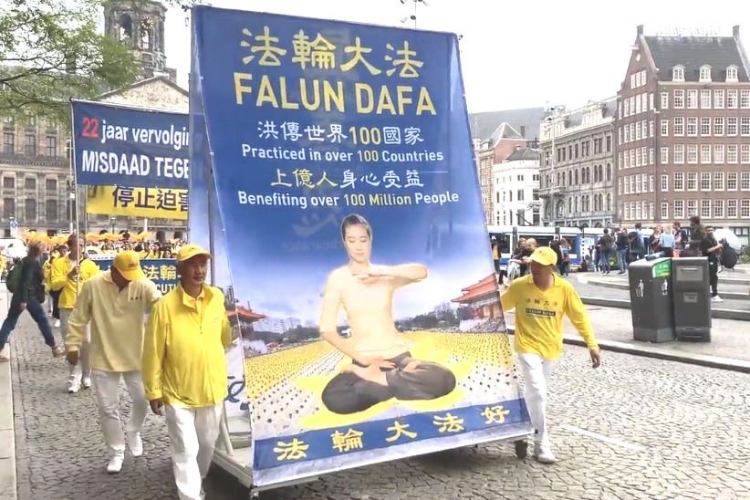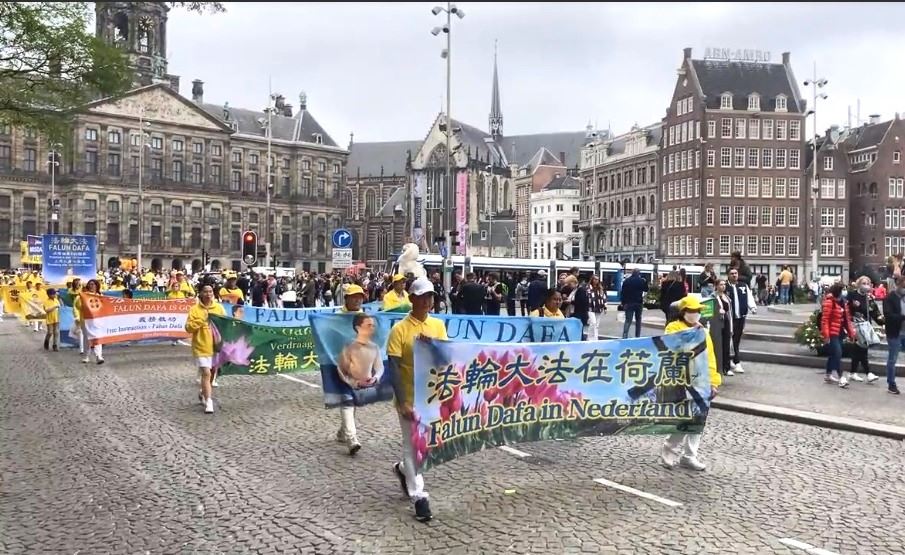 图1:二零二一年九月二十五日,荷兰和部份欧洲法轮功学员在首都阿姆斯特丹市中心水坝广场(Dam),举行了反迫害集会和游行,呼吁全社会关注中共迫害法轮功的罪行,共同制止这场罪恶。