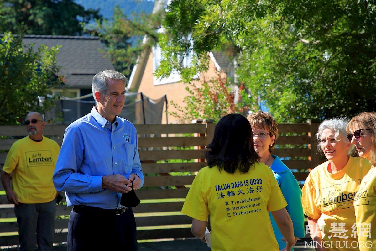 ![]() 图1:市长拉森市长 (左二)和华州国王县议员凯西·兰巴特女士(左四)聆听法轮功学员讲真相 |