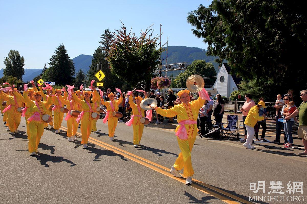 法轮功队伍进入游行路线,人群中纷纷表示“太美了”、“谢谢你们的光临!”“你们的花车最棒了!”法轮功学员在花车上示范动功和静功。花车上身着传统服饰的两位越南大法弟子和一位少年大法弟子向人群致意。腰鼓队的学员们随着法轮大法好和喜庆的音乐表演中国传统的腰鼓与大鼓,他们的鼓声增添了这座城市的喜庆气氛。人们为法轮功的队伍热烈鼓掌。