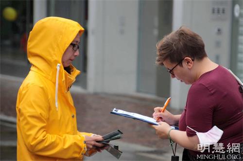活动结束时,密集的雨点再次落下,一位附近的店主冒雨找到法轮功学员,和学员作了长时间的交谈,并在征签表签名。她表示自己曾收到过关于法轮功的真相资料,所以想能帮助制止迫害。