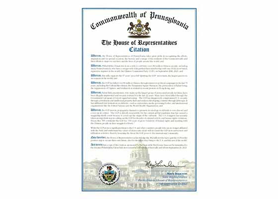 宾州众议院向大费城法轮大法学会发来的嘉奖令,声援3.8亿中国人退出中共邪党及附属组织。