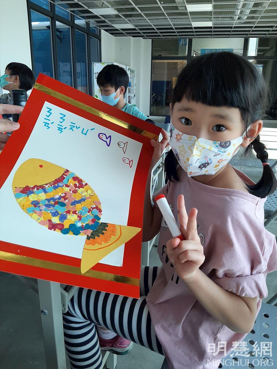 '图4:刚上学的小朋友秀出祝福的图案,祝福大家年年有馀。'