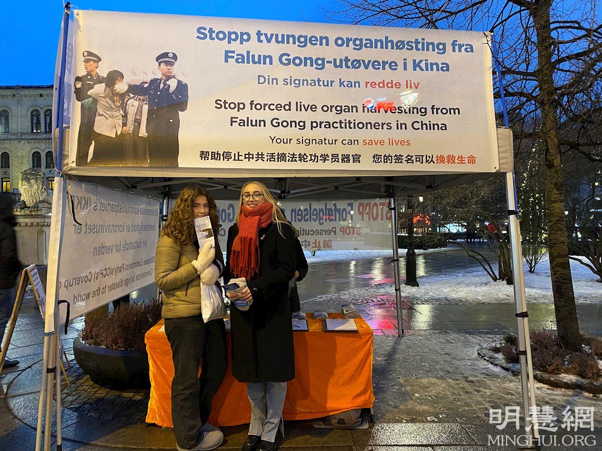 海莲娜(Helene),伊米(Immy)和朋友在奥斯陆大学生物系就读。她们与法轮功学员长时间交谈,了解了许多中共迫害法轮功学员的手段,她们说:“迫害太恐怖了,过去我们不太了解。现在我们要支持反迫害,这是一件重要的事。”