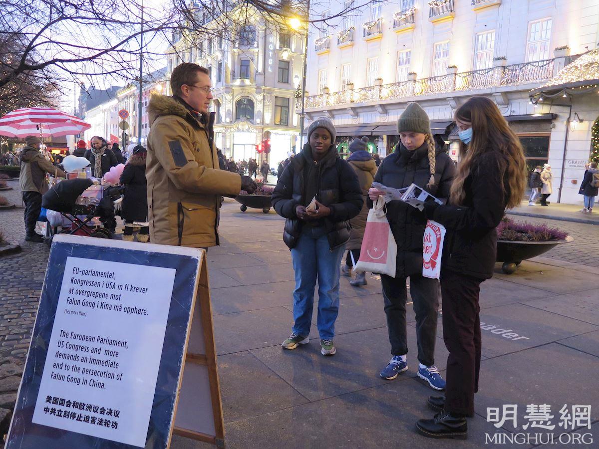 【明慧网二零二二年一月二日】二零二一年岁尾之际,挪威法轮功学员在坐落在首都奥斯陆市中心的游行街,卡尔·约翰大街(Karl Johans gate)上的国会前设真相点。奥斯陆的真相点除了在二零二零年因疫情短暂中断外,多年来每周六在市中心向民众揭露中共对法轮功学员的迫害,呼吁结束中共的暴行。