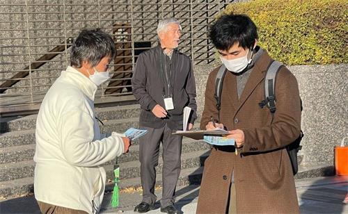 明白真相的日本市民买来了热乎乎的饮料送给法轮功学员,学员们感谢民众的善意,也体会到了明白真相的人们是越来越多了。