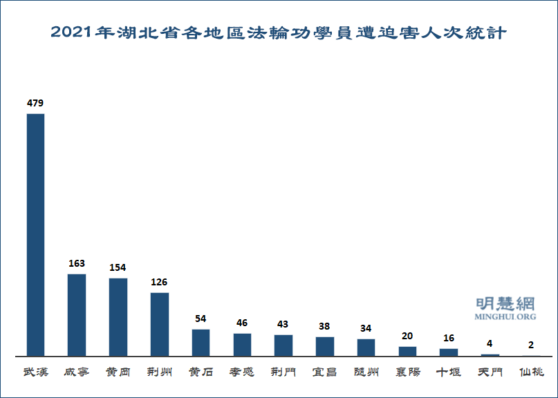 二零二一年遭迫害人次比二零二零年634人次增加546人次,几乎增加一倍。其中:武汉地区479人次、咸宁地区163人次、黄冈地区154人次、荆州地区126人次、黄石地区54人次、孝感地区46人次、荆门地区43人次、宜昌地区38人次、随州地区34人次、襄阳地区20人次、十堰地区16人次、天门地区4人次、仙桃地区2人次。