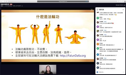 图2~3:中文网上学功班,主持人在介绍法轮功。