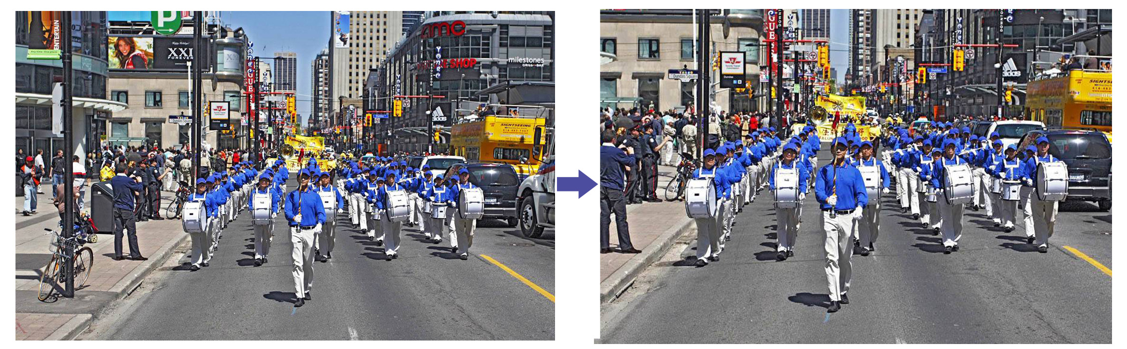 另外裁切也很重要,合理裁切可以去掉干扰元素,使画面干净,视线焦点更集中,如图5。若想保留地标类建筑,也要注意怎样构图可以去掉广告牌上的常人照片。