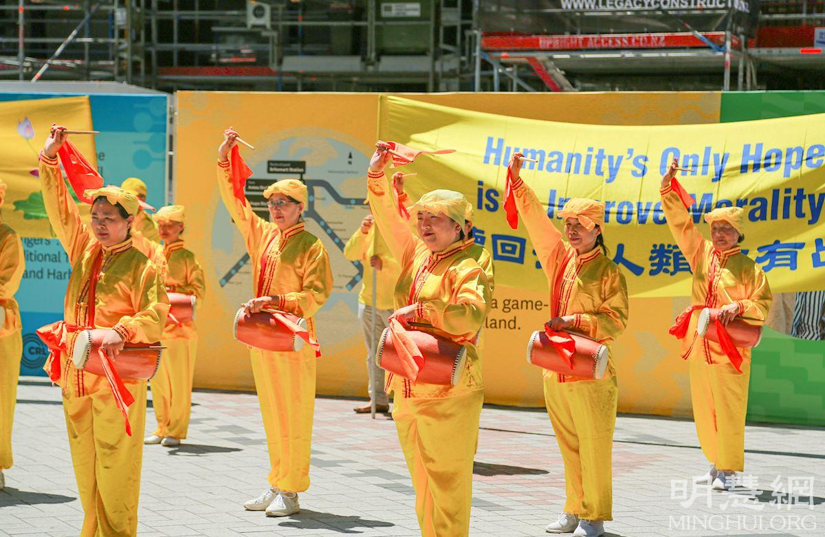 法轮功学员组成的天国乐团、舞龙队、腰鼓队的表演受到了人们的赞赏。学员们希望在这疫情的艰难和特殊时期,能够给人们带去希望和祝福。