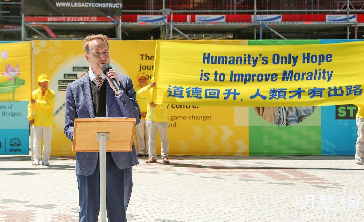 新西兰著名人权律师凯瑞·高尔(Kerry Gore)在集会发言中说:“今天我要借这个机会,祝愿法轮大法创始人李洪志大师新年快乐。法轮大法自一九九二年在中国传出,现在传遍世界许多不同的国家,数以亿计的人修炼法轮功。”