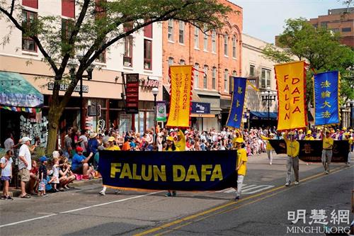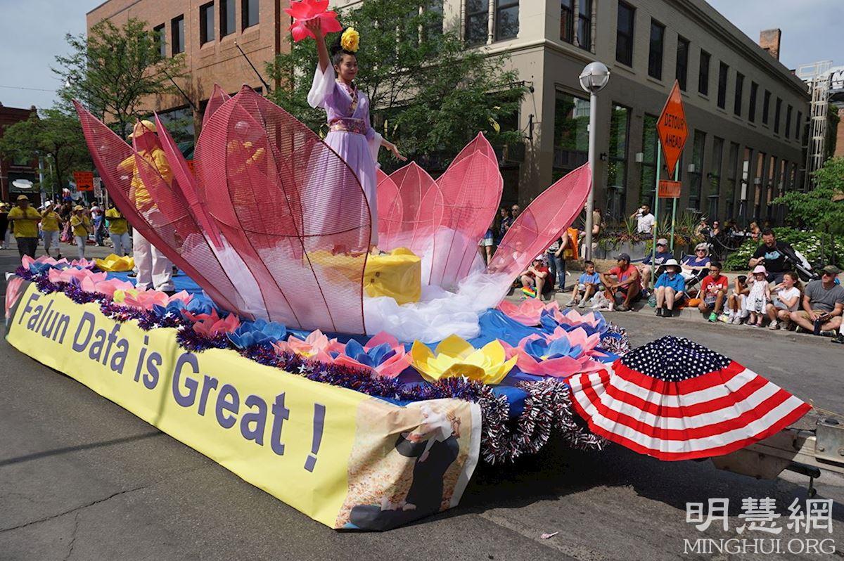 ![]() 图1~2:二零一九年七月四日,密西根州法轮大法学会应邀参加了当地庆祝美国243岁生日的庆典活动。图为法轮功学员组成的游行方阵和精美花车。 |
