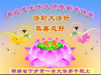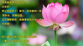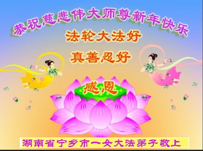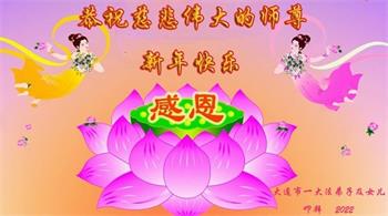 她说:“我发自肺腑地感谢师父对我的慈悲,给了我得法的机会。在修炼的旅途上,会有如意和不如意的事情发生,我都会开心应对。在师父和大法的指引下,精進修炼。向师父致以最深的谢意。恭祝师父过年好!”
