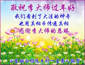 一位做生意的男士说:“我父亲学大法,身体健康,精神愉快,他整天乐呵呵的,与世无争。我父母亲都是八十六岁的花甲老人了,他们生活都能自理,不用我们操心,我们姐弟们都看到了大法的神奇,支持他们修炼。我做买卖,用真相币向人们传递真相,助大法弟子一臂之力。现在我们家庭和睦,买卖红火。感谢李大师给我们的恩赐,恭祝李大师过年快乐!”