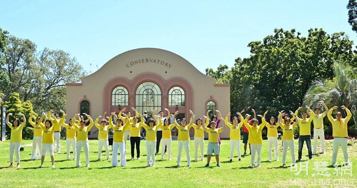 ![]() 图3:二零二二年一月二十三日,新学员翠音(Trang,前排左四)和越南法轮功学员在墨尔本市中心集体炼功。 |