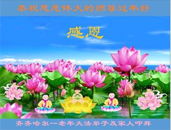 师父好!我太幸运了,我得法了!我今年九十一岁,得法还不到一年的时间,但是我天天学法炼功从来没有间断过,《转法轮》我已经读过六遍了,各地讲法我也看的差不多了。我心身受益很大,不仅无病一身轻而且身心都在向年轻人方向退。我无法感谢师父的救度之恩,就想听师父的话,助师正法——救人,我想利用过年期间向亲戚朋友讲真相,证实法轮大法的美好神圣,把他们能救下来。我也要做好三件事,跟师父回家!谢谢师父!