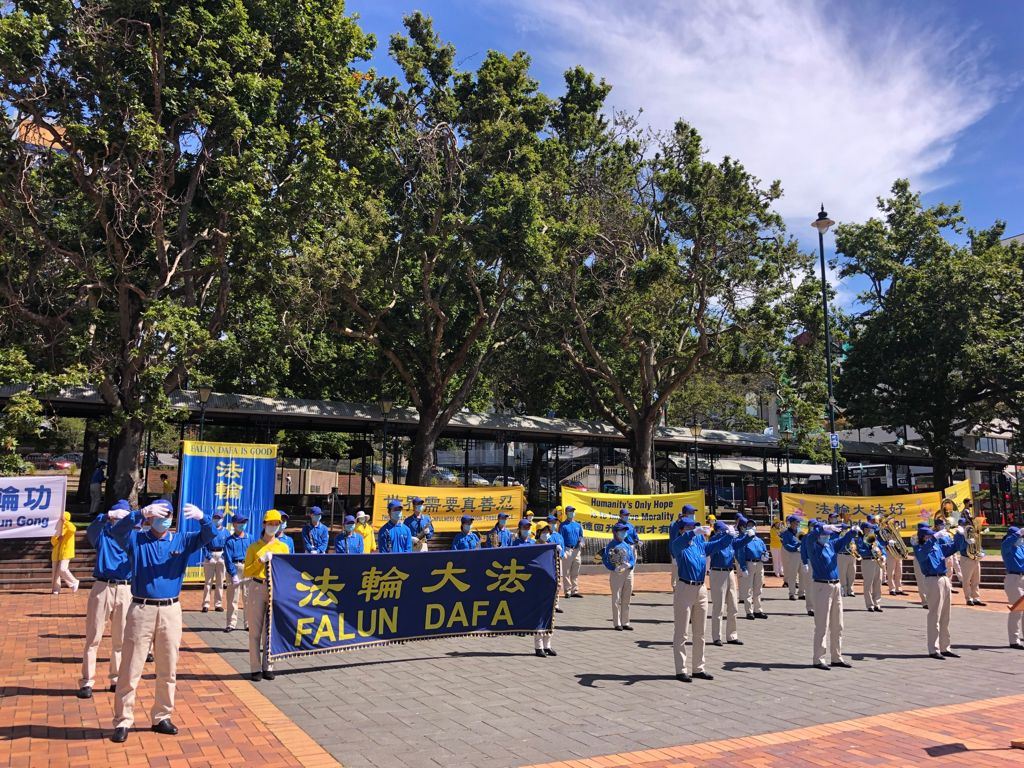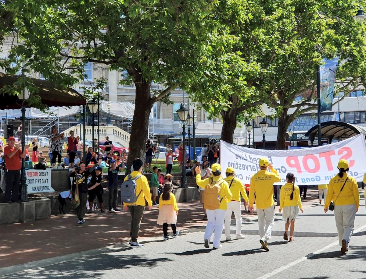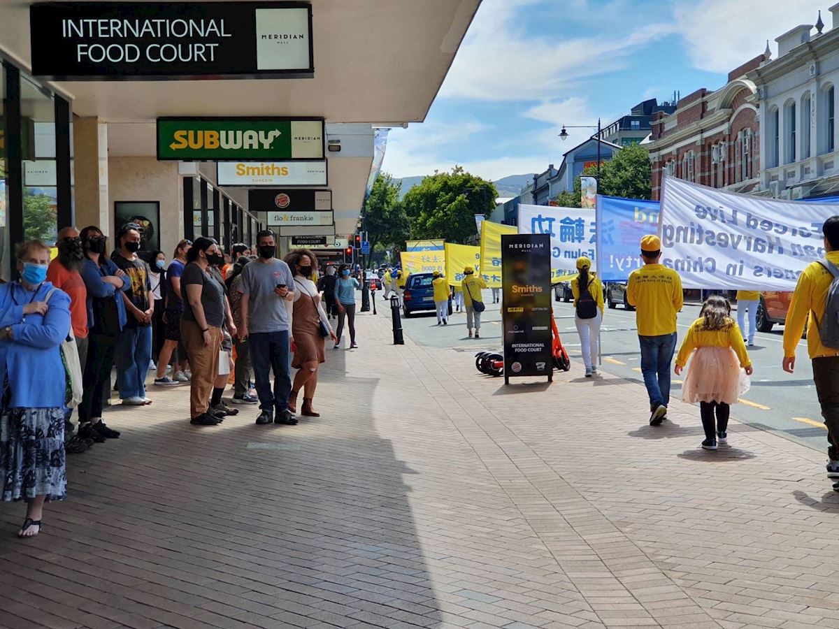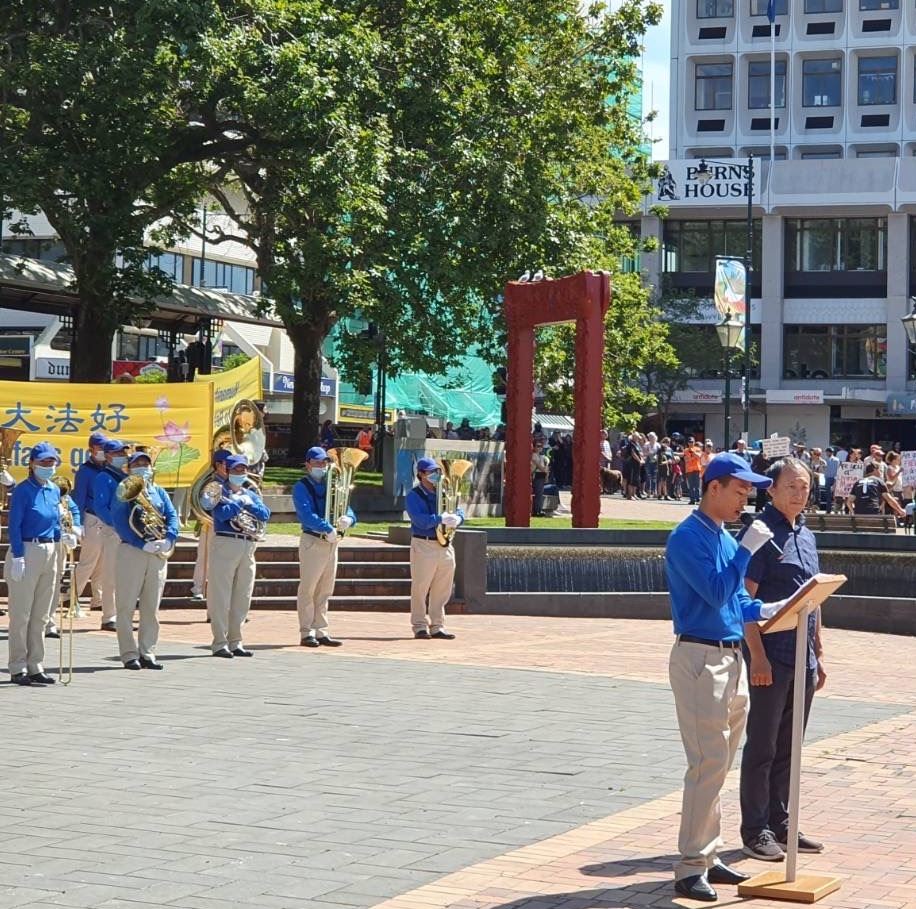 当游行开始时,来自新西兰自由人权组织(Freedoms & Rights Coalition NZ)民众也在举行活动,他们向法轮功学员们报以热烈的掌声,对学员们坚持信仰、反对中共迫害表示支持和敬意。