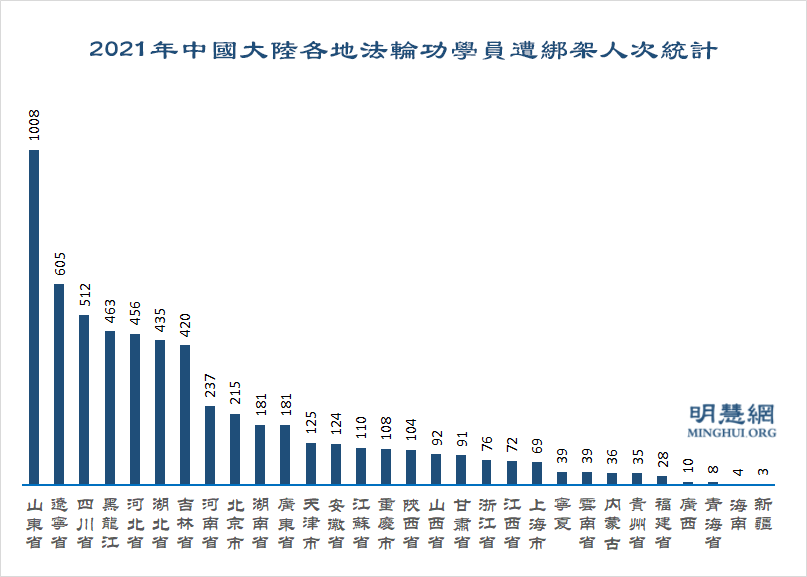 图3:2021年中国大陆各地法轮功学员遭绑架人次统计