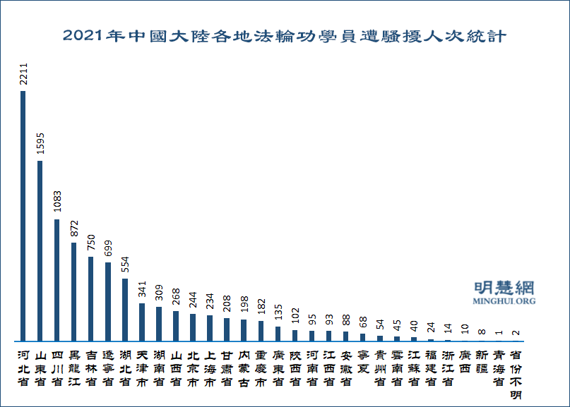 据明慧网报道统计,二零二一年中共警察、街道社区人员骚扰法轮功学员10527人。骚扰最严重地区:河北省2211人,山东省1595人,四川省1083人,黑龙江872人,吉林省750人,辽宁省699人,湖北省554人。
