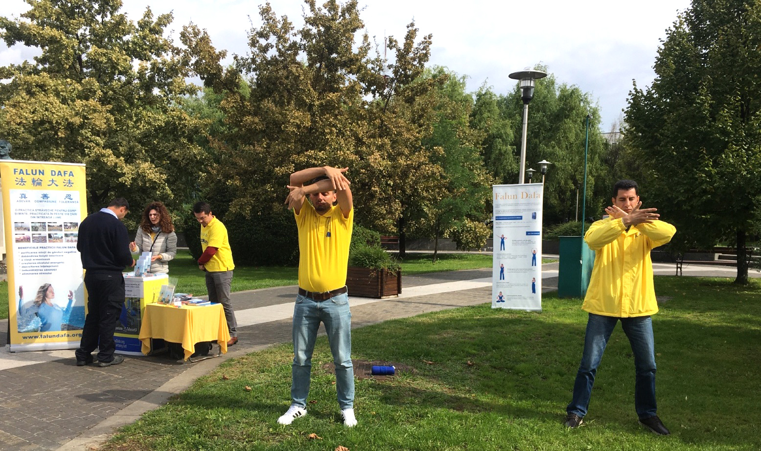 九月二十三日,法轮功学员设立了展位,并在展位前炼功,示范功法。人们被法轮功学员祥和的炼功场面所吸引,停下脚步观看,并索要真相资料。
