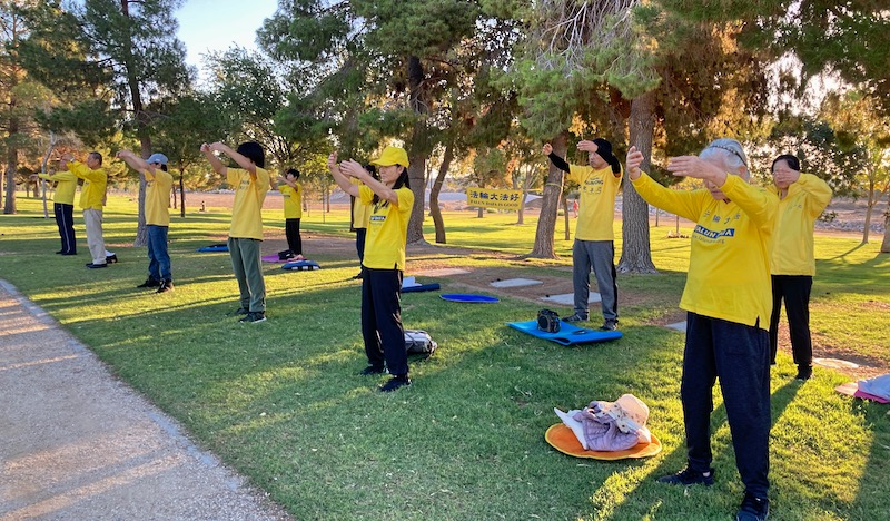 ![]() 图1:二零二二年九月十一日,美国拉斯维加斯部份法轮功学员在日落公园集体炼功、洪法。 |