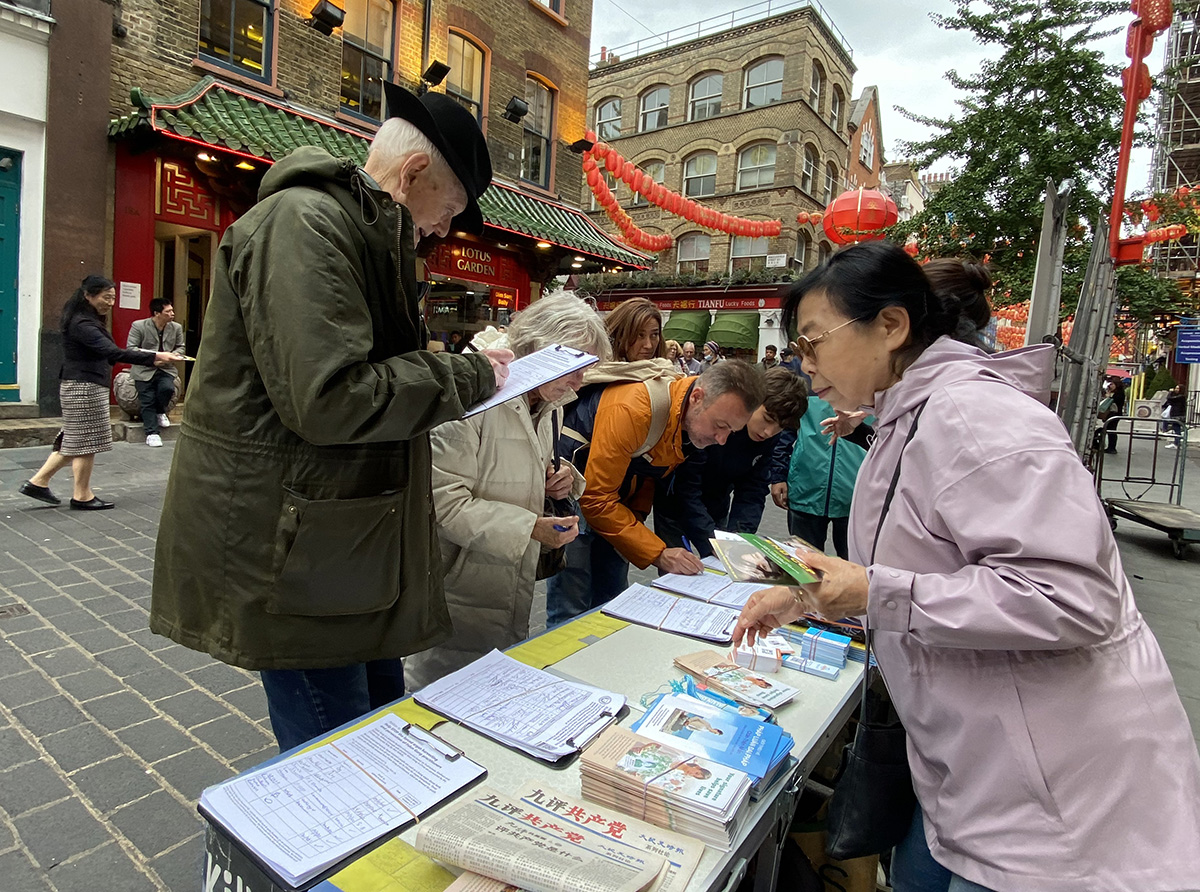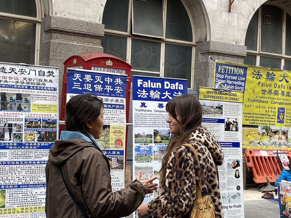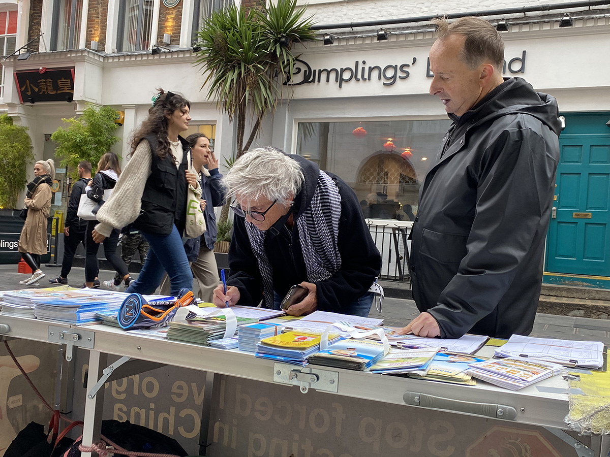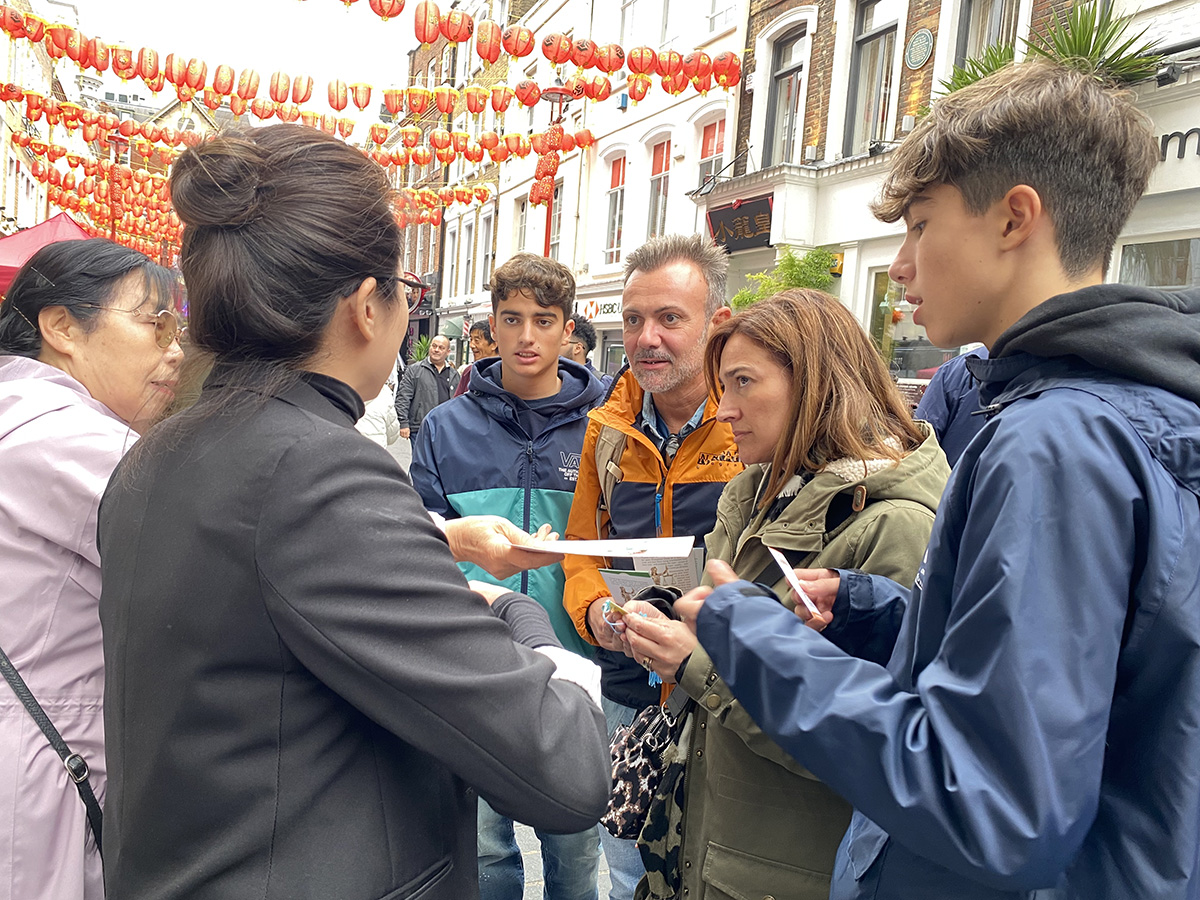 【明慧网二零二二年十月二日】二零二二年九月三十日,英国伦敦的部份法轮功学员们和往常一样,再次来到唐人街,向人们介绍法轮功并揭露中共对法轮功的迫害。