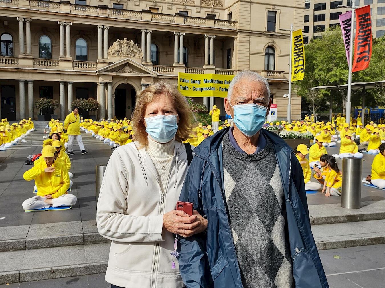 凯茜(Cathy)和大卫(David)也被法轮功学员祥和的炼功场面所吸引,看到学员们在闹市也能静静地打坐,凯茜赞叹:“真是太美了。”