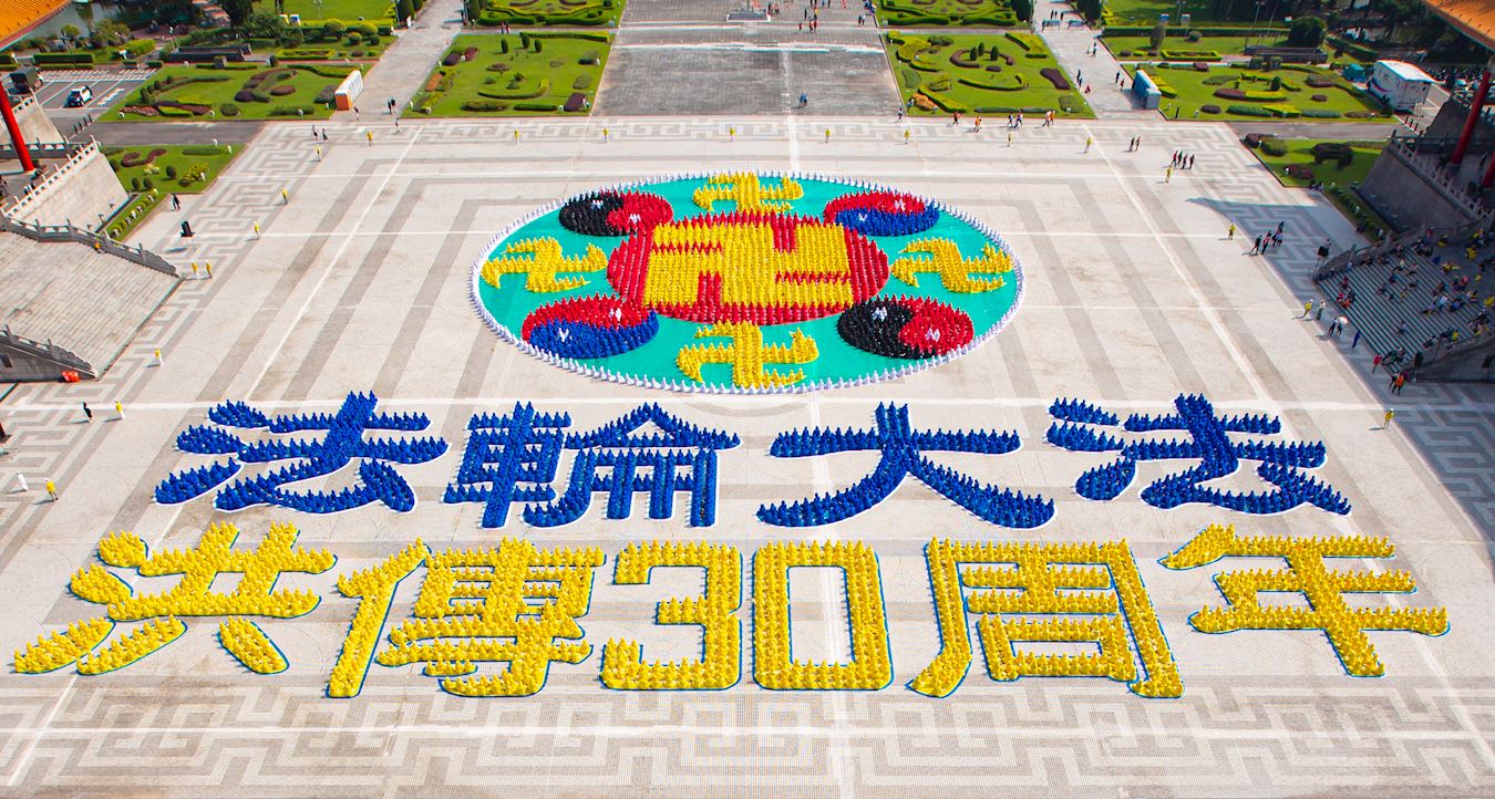 图1:五千名法轮功学员在台北中正纪念堂自由广场排出殊胜“法轮图形”及“法轮大法洪传30周年”。