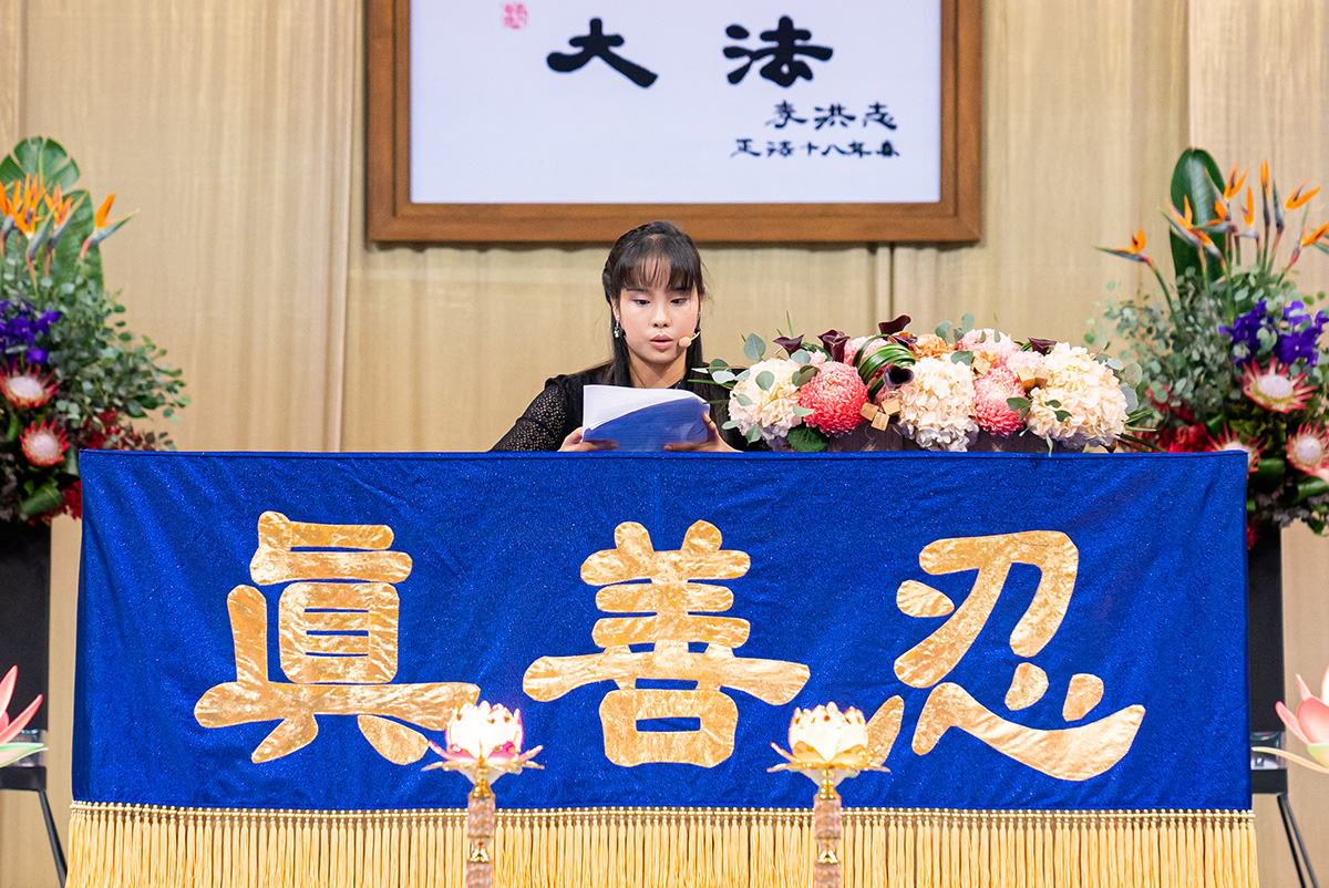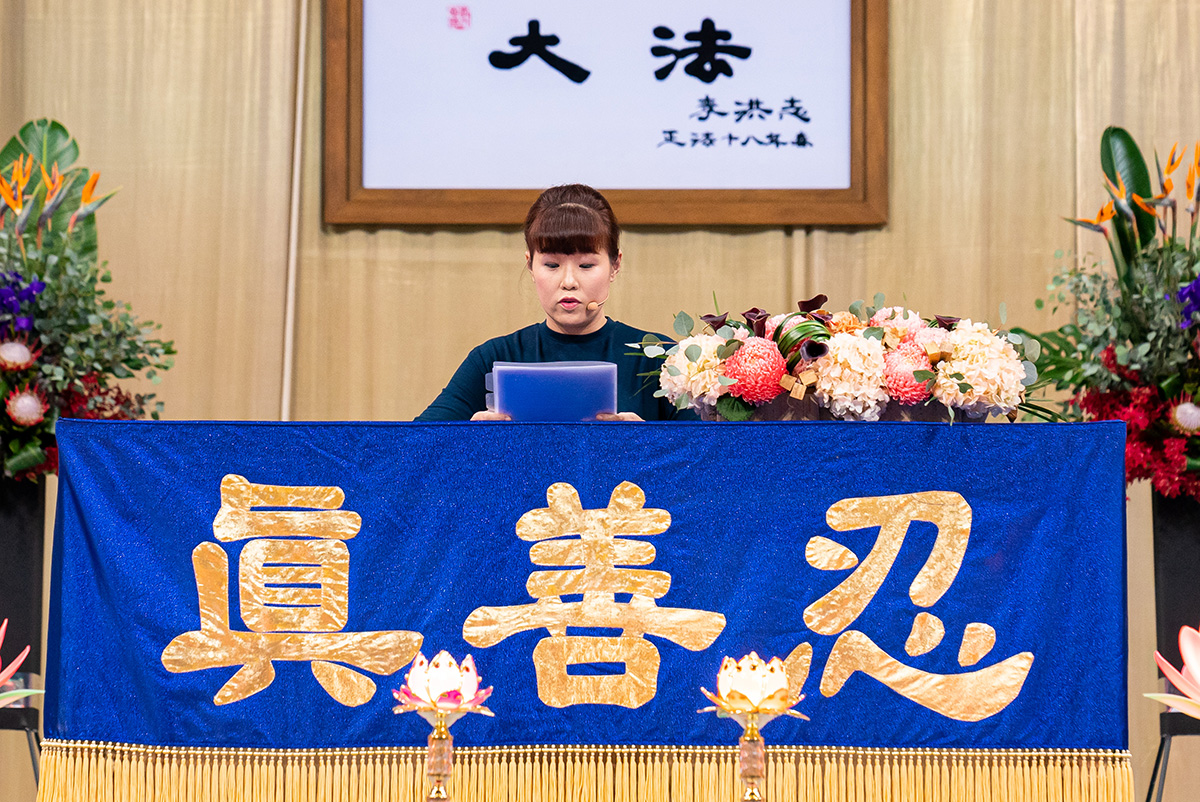 主席台正中央高挂李洪志师父法像与“真善忍”、“法轮常转”两面法轮图形;师尊词句“慈悲能溶天地春 正念可救世中人”[1]高悬两侧,多面印着《洪吟》中的诗词横幅环绕全场,会场气氛殊胜庄严。这次法会共有十九位学员发言,交流他们在修炼中内找自己、实修心性、用心救人的体悟,深深触动每一位在场的学员。
