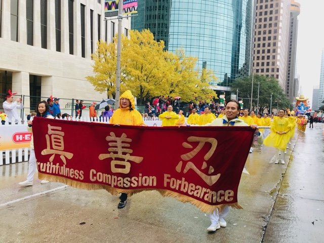 法轮功学员的队伍是参加本次游行的唯一亚裔社团。游行队伍,由镶着金色的“法轮大法好”和“真善忍”中英文的大横幅开道;随后是炼功队一边行进一边展示祥和法轮功功法;其后是腰鼓队,腰鼓队队员在法轮大法好的歌声中敲着有节奏的鼓点,精神抖擞前行;队伍最后是舞龙队压阵,一条黄色巨龙时而上下翻飞、时而盘旋起伏……法轮功学员的队伍受到了两旁观众的热烈欢呼。