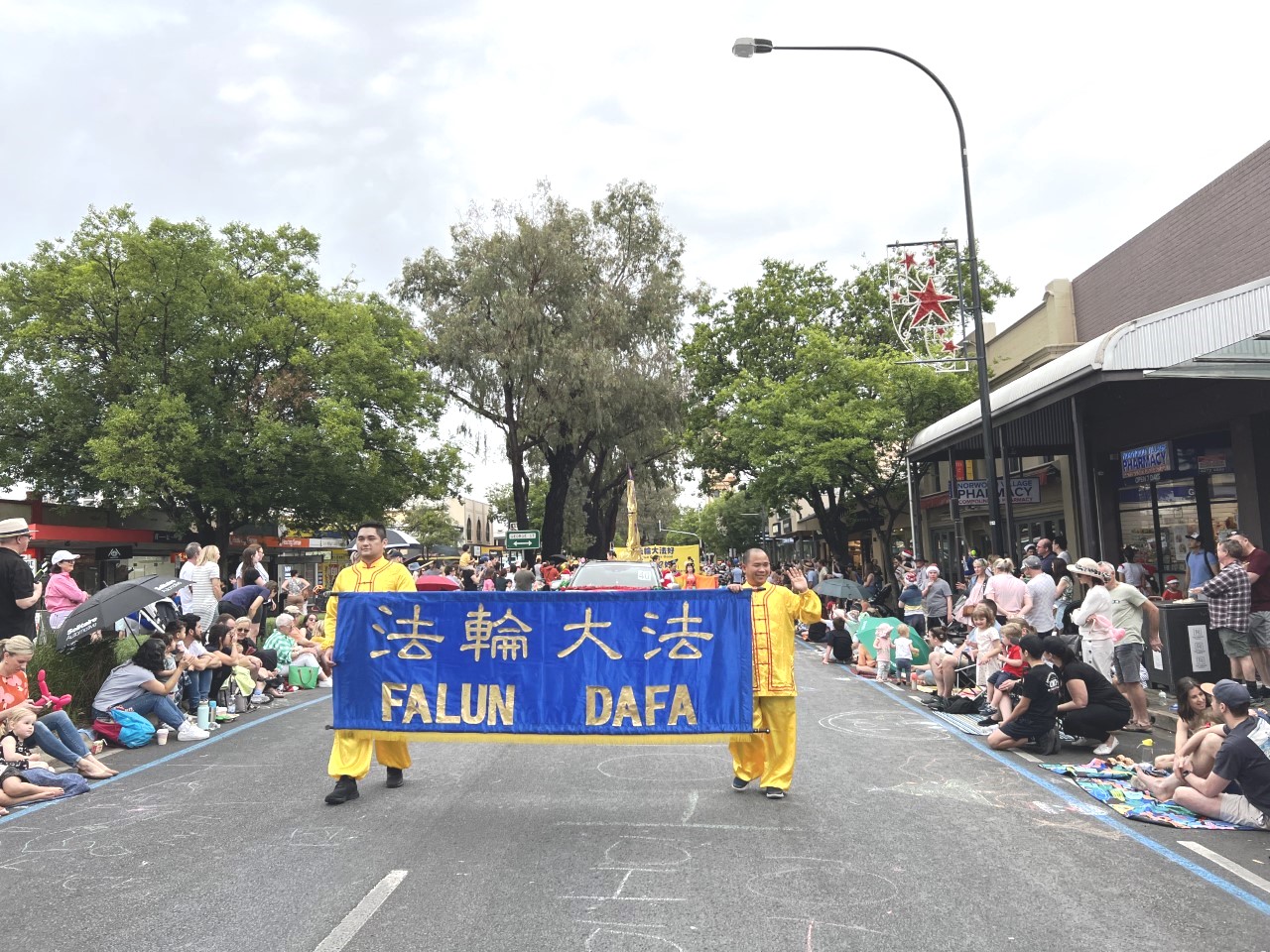 图1~3:二零二二年十一月二十六日,南澳大利亚阿德莱德法轮功学员应邀参加诺伍德市(Norwood)的圣诞花车游行。