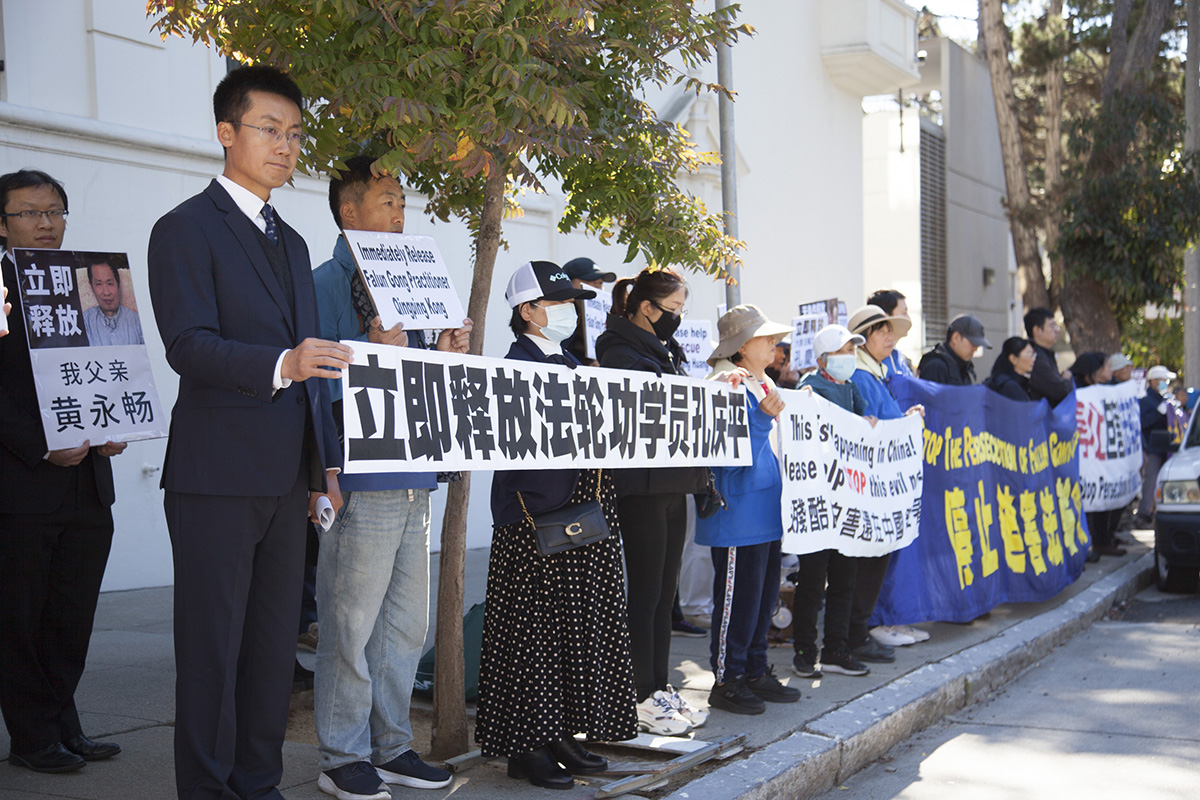 ![]() 图1~3:二零二二年十一月三日,旧金山湾区法轮功学员在旧金山中领馆前举行抗议集会,要求中共立即释放近日被绑架的法轮功学员孔庆平和黄永畅。 |