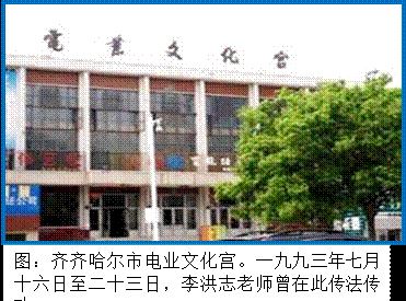 一九九三年七月十五日,伟大的师尊踏上了齐齐哈尔市的这片土地,在市中心的电业文化宫开始了在黑龙江省的首次传功讲法。短短的九天时间里,师父给我们讲法,教我们炼功,手把手的纠正我们的炼功动作……师父的音容笑貌、师父的魁伟身影、师父的叮咛嘱托、师父打出的法轮,一起永远旋转和停留在这片北国土地上。