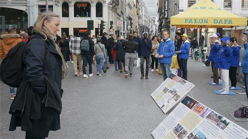 秋假的最后一个周末,商业大街人来人往。介绍法轮大法以及中共迫害法轮功学员的展板吸引着人们驻足观看着谈论着。不少人在反对迫害的签名簿上签名,支持法轮功学员反迫害。