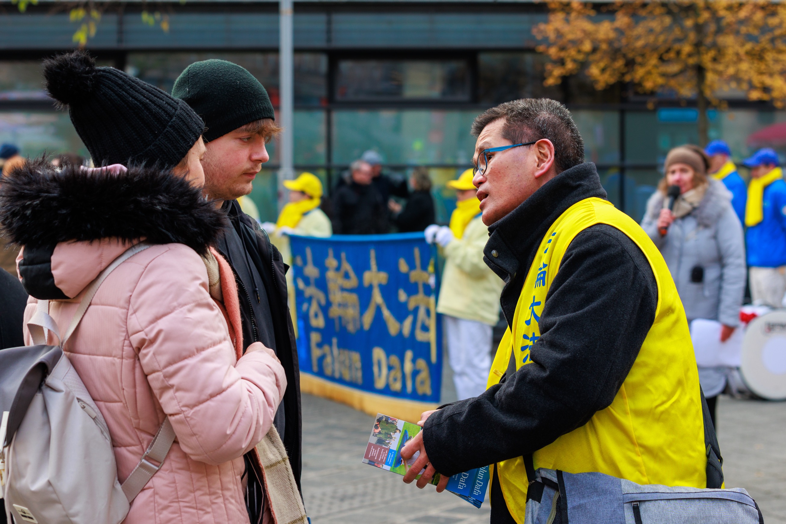 法轮功学员集会现场在老城的哈尔广场(Hallplatz),集会引来众多民众关注。不少人认真聆听发言,和法轮功学员交谈,了解真相的民众纷纷签名声援法轮功学员反迫害。