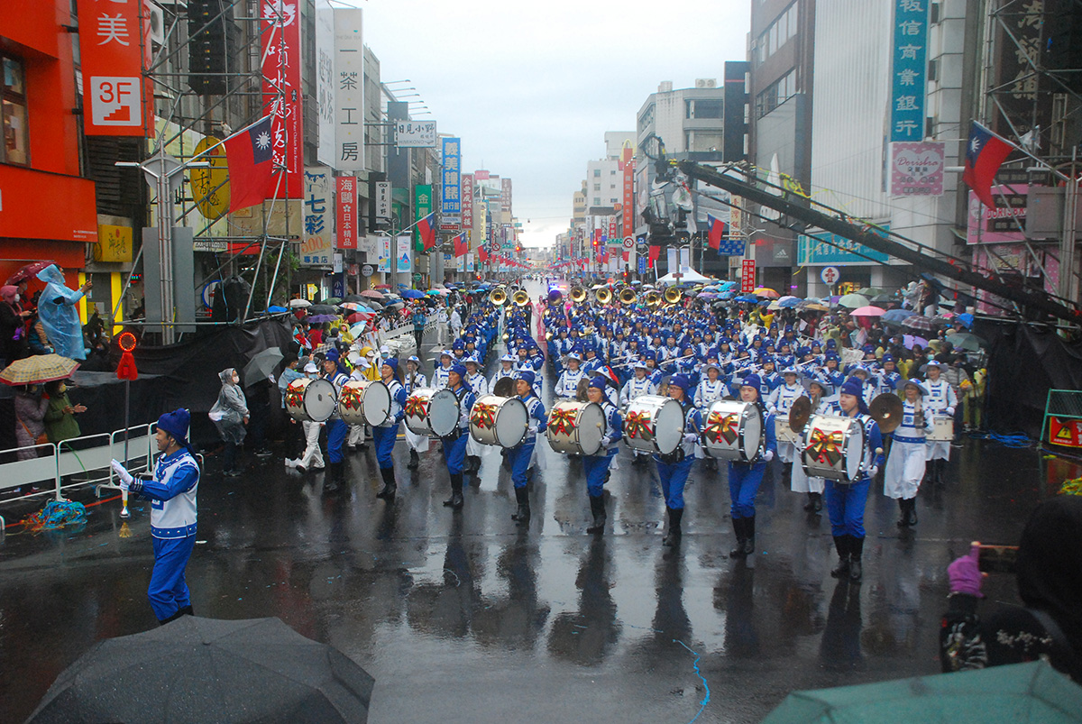 约两百位团员组成的天国乐团,团员身穿古代服装,乐队由“法轮大法”字样的蓝色横幅前导,给热闹的嘉义街道带来喜庆而古朴的气息。乐团行进至中山路圆环时,演奏出重新改编耳熟能详的《高山青》乐曲,赢来了观众热烈掌声。
